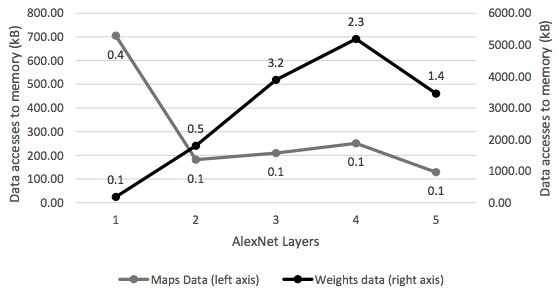 The figure above shows the size of weights and maps data moved to and from memory by the Snowflake system. The left axis is for the maps and the right axis is for the weights. The numbers written above each point are the bandwidth in GB/s. AlexNet requires an average bandwidth of 1.53 GB/s.