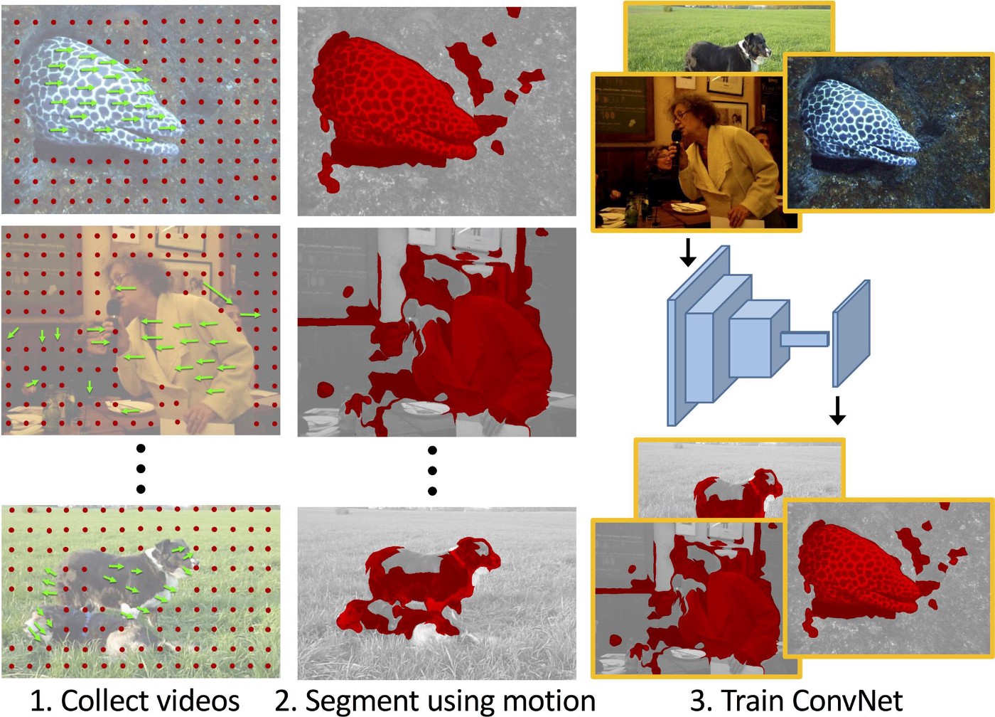 This recent paper (April 2017) trains unsupervised models by looking at motion of objects in videos. Motion is extracted as optical flow, and used as a segmentation mask for moving objects. Even though optical flow signal does not give anywhere close to a good segmentation mask, the averaging effect of training on a large data allow the resulting network to do a good job. Examples below.