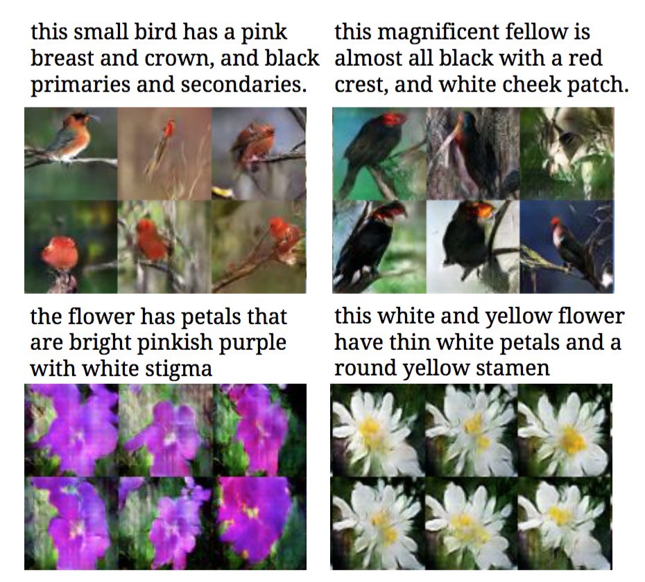 What I appreciate the most about this work is that the network is using the textual description as input to the generator, as opposed to random vectors, and can thus control accurately the output of the generator. A picture of the network model is here: