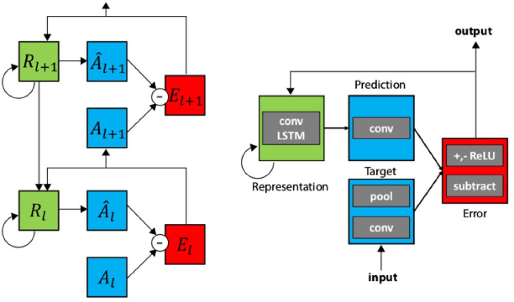 PredNet combine bio-inspired bi-directional [models of the human brain] (https://papers.nips.cc/paper/1083-unsupervised-pixel-prediction.pdf). It uses predictive coding and using [feedback connections in neural models] (http://arxiv.org/abs/1608.03425). This is the PredNet module and example of 2 stacked layer: