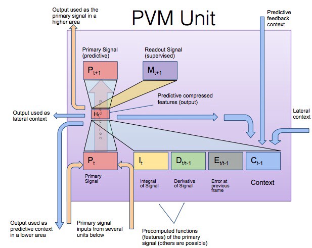 The PVM unit is given below. It has inputs from multiple lower layers, to which it also provides feedback, and lateral connections. The feedback is time-delayed to form recurrent loops.