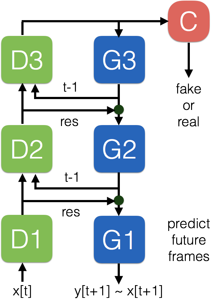 we added a classifier C to predict fake vs real generated frame. Our network discriminator or encoder D is like a standard multi-layer neural network, and so we place the classifier C after all green layers. The blue generative or decoder layer instead are useful to reconstruct future images or representation. More details is here.