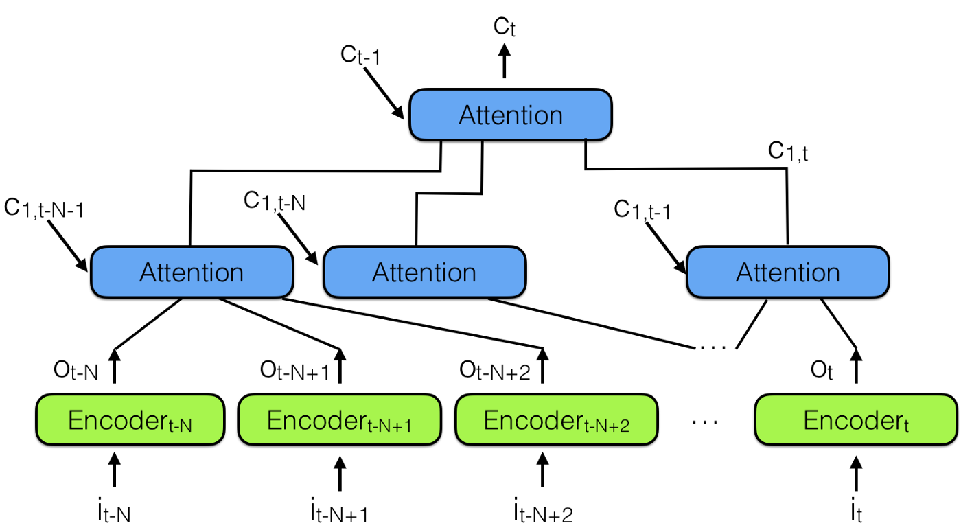 Notice there is a hierarchy of attention modules here, very similar to the hierarchy of neural networks. This is also similar to Temporal convolutional network (TCN), reported in Note 3 below.
