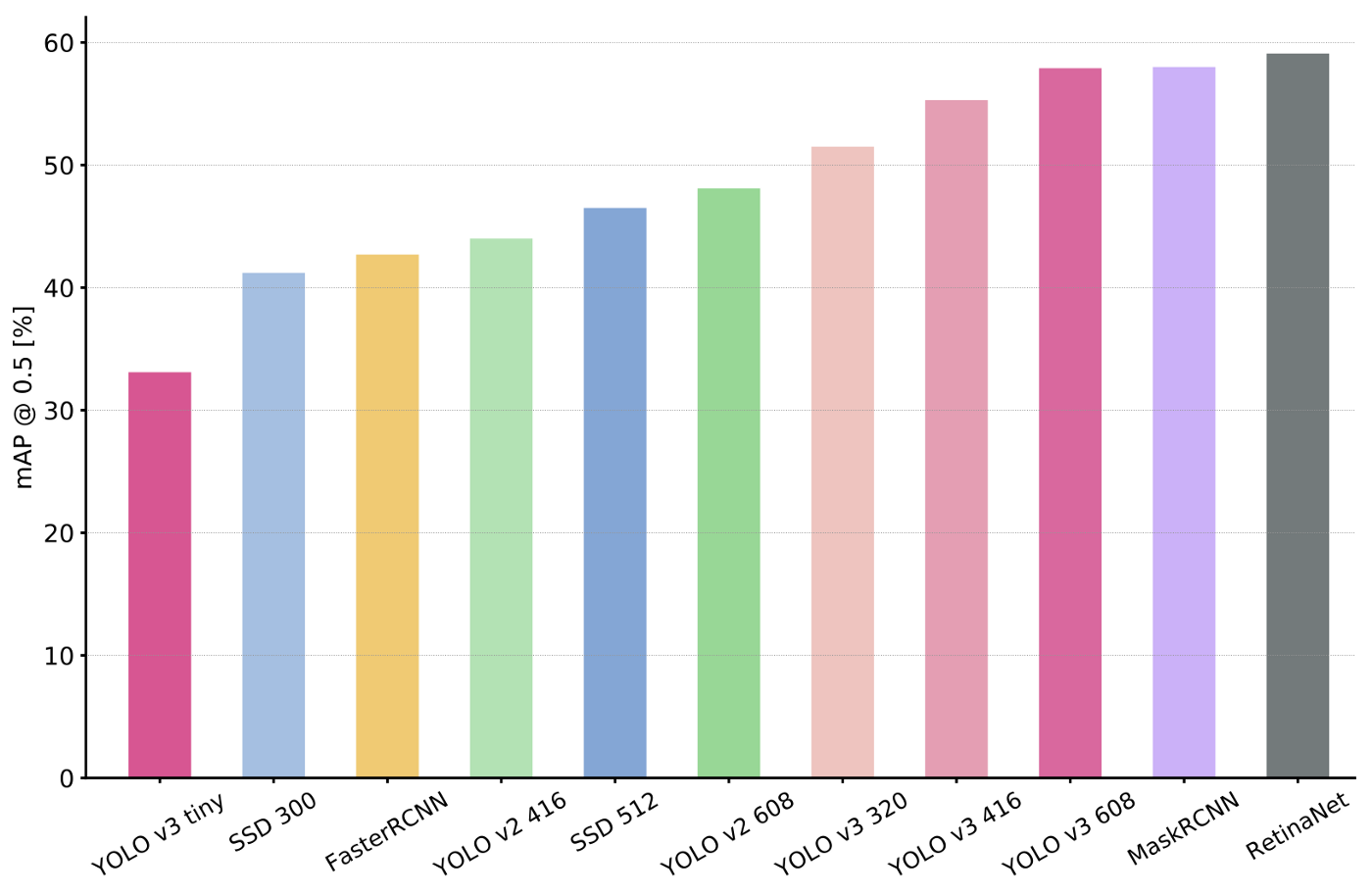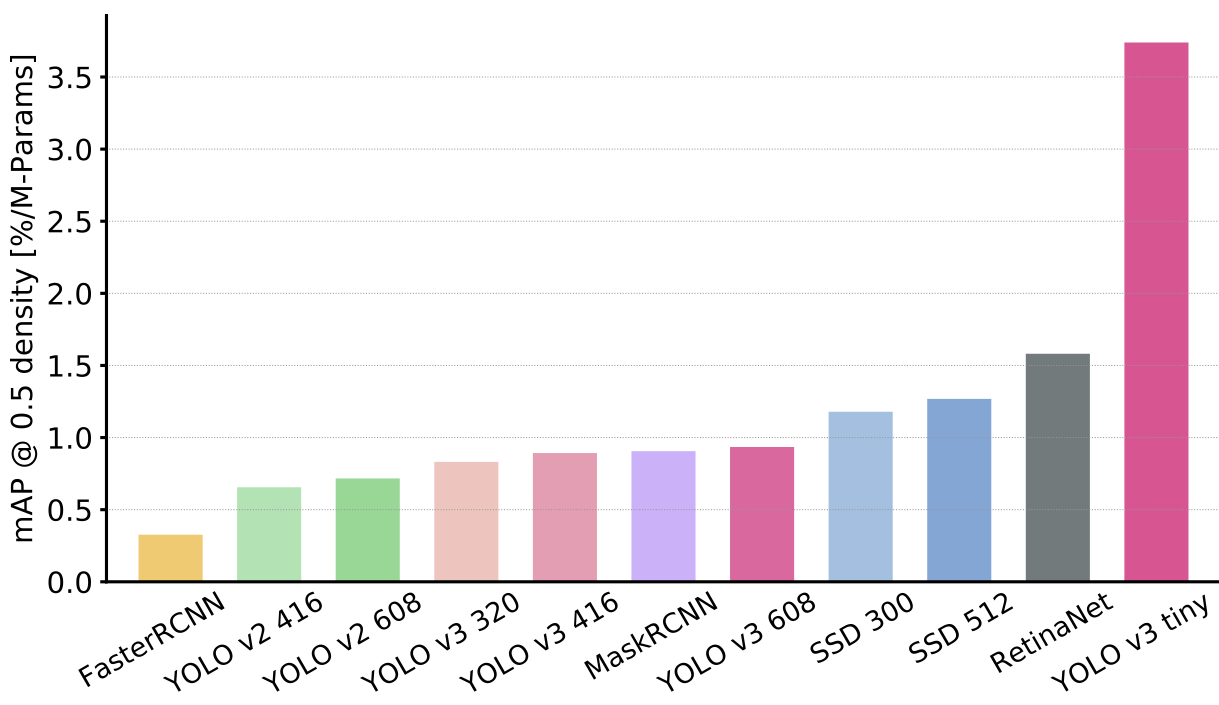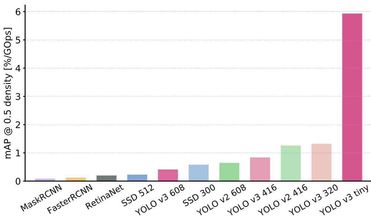 - Only diminishing returns in accuracy is achieved by increasing the number of operations on the same architecture (eg: Yolo v3 % increase in accuracy decreases with increase in ops)