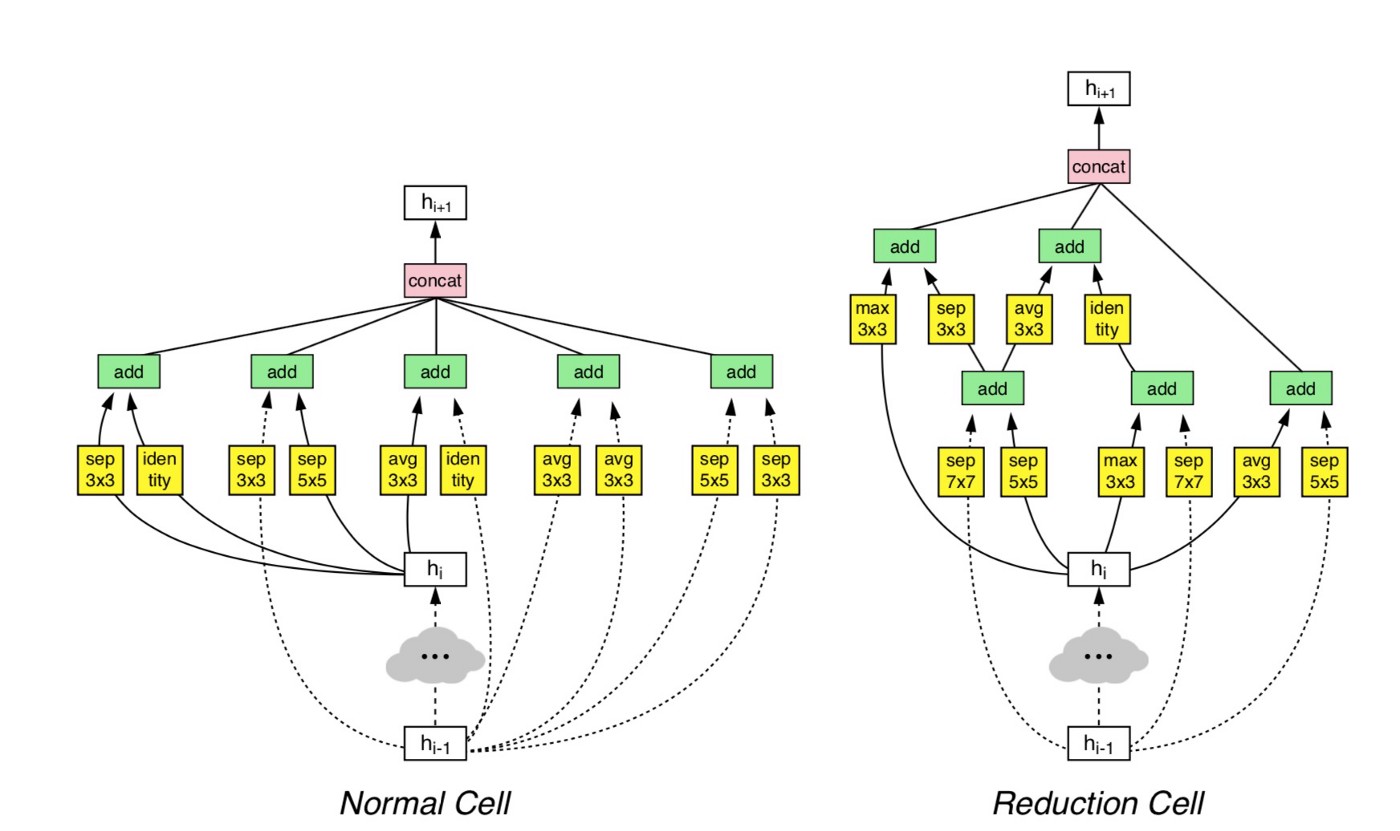 Interestingly below you can see the best cells found by the algorithm in the figure below. They seem to be more complex version of the Inception-ResNet layers.