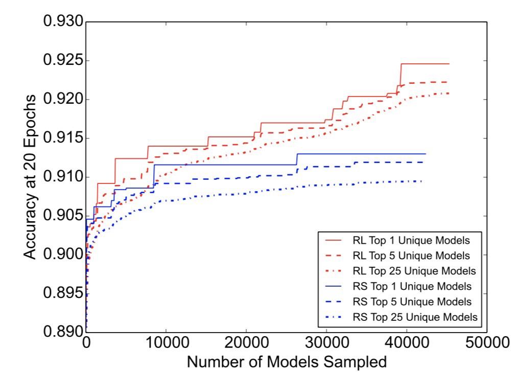 Comparing the efficiency of random search (RS) to re- inforcement learning (RL) for learning neural architectures