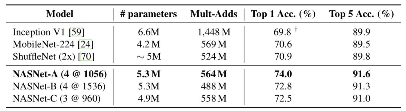 The results are nice! They find both large and small neural networks that are very efficient and high-performance compared to human hand-crafting. Below we report a table of the small models.