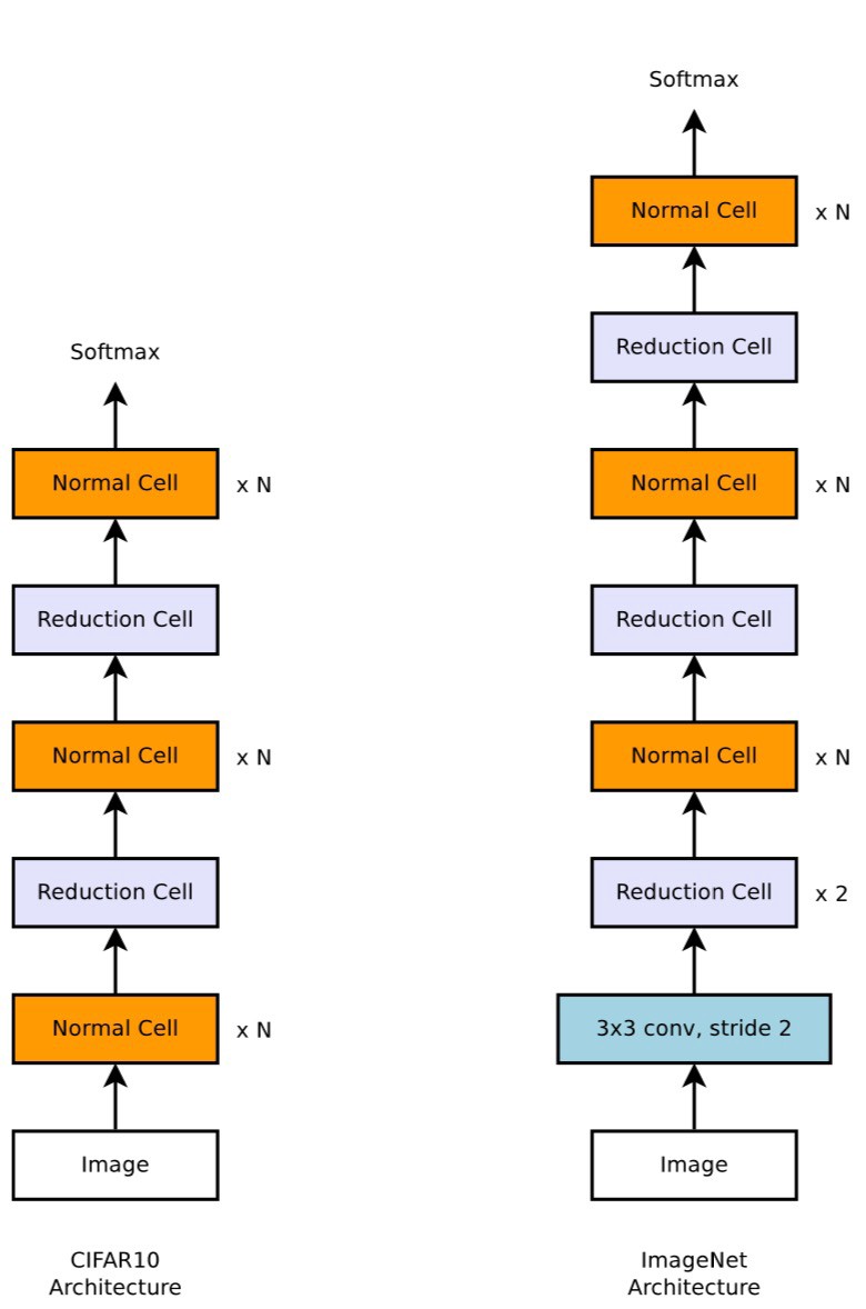 They create architectures such as the ones on the left side image. Based on previous architecture history, they decide that the overall architecture should be composed of two types of cells: (1) convolutional cells that return a feature map of the same dimension or Normal Cell, and (2) convolutional cells that return a feature map downsampled by two in height, width or _Reduction Cel_l. Notice that in these architecture they also double the number of filters in the output whenever the spatial activation size is reduced in order to maintain roughly constant hidden state dimension. Notice also that this architecture on the left picture is somehow similar to the blocks in ResNet, including the choice of normal and reduction cells.