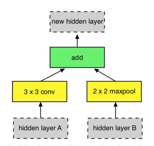 In order to reduce the number of possible combination of parameters, they use a fixed constructed block architecture illustrated in the figure below. This block can implement residual-like layers and googlenet-type layers. They allow the RNN controller to find multiple blocks fora each layer, generally 5, a good compromise between effectiveness and search space.
