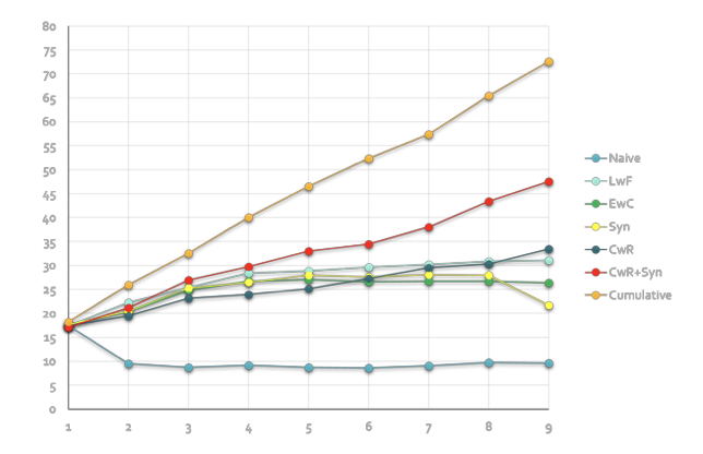 The effect of AR1 (CwR+Syn) is displayed in the figure below. This is on the CORe50 dataset. Other methods are also evaluated. Cumulative is the method where one creates a large dataset from all the dataset and trains from scratch.