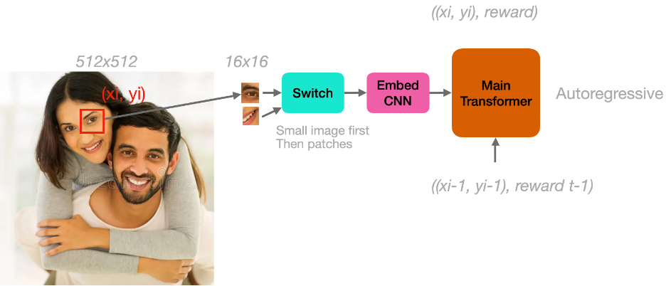 - A multi-modal Mix-Match Transformer model to learn correlation of right fixations and positive rewards (right, +rewards) and prediction (looking there may give me a +reward)